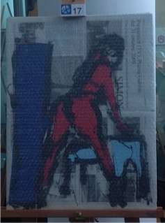 “Ragazza con elementi architettonici” collage su carta di giornale e smalto con pluriball
