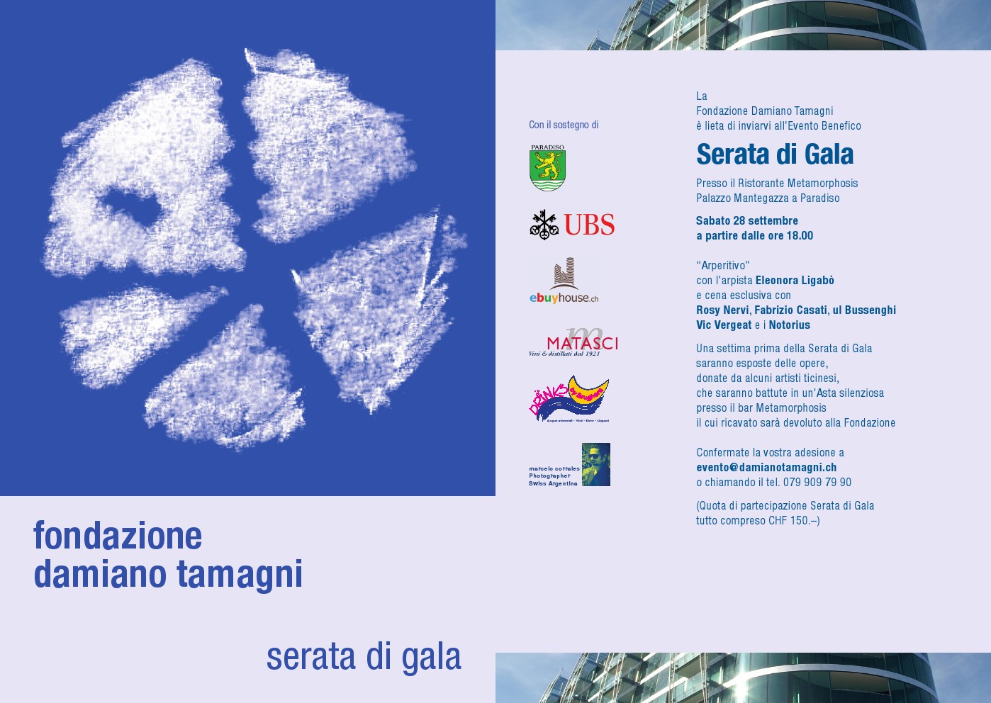La Fondazione Damiano Tamagni è lieta di invitarla alla serata di Gala di sabato 28 settembre 2013 presso Ristorante Metamorphosis, Palazzo Mantegazza a Lugano-Paradiso.