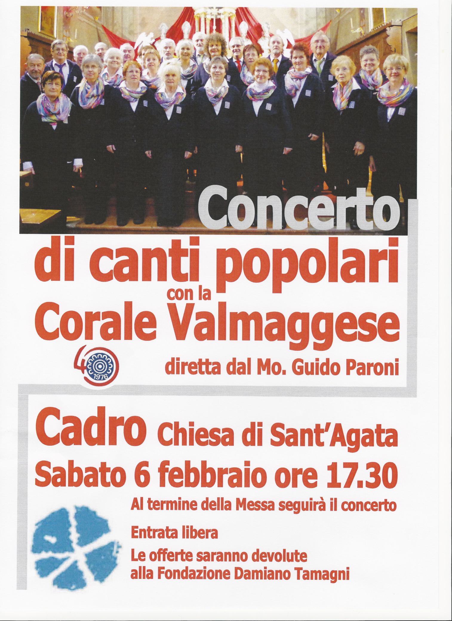Sabato 6 febbraio alle ore 17.30 presso la Chiesa Sant’Agata di Claro, concerto di canti popolari con la Corale Valmaggese diretta dal Mo. Guido Paroni. Entrata libera, le offerte saranno devolute alla Fondazione Damiano Tamagni.